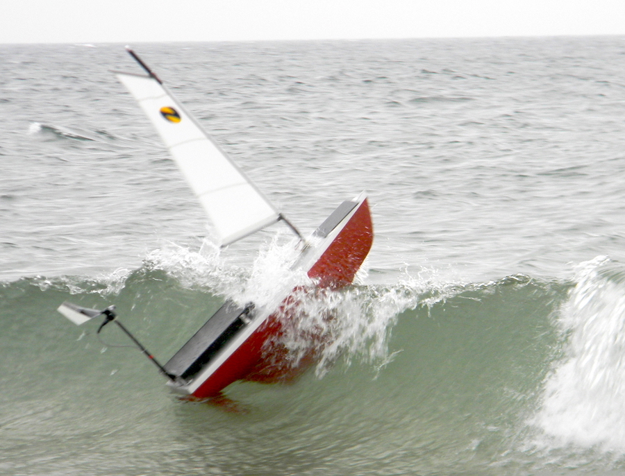 The 1.2 meter (4-foot) long MaxiMOOP is a small boat designed as a joint project between the U.S. Naval Academy and Aberystwyth University specifically for autonomous sailing. It differs from the typical remote-controlled model boats that are designed for racing (or scaled down from full-size sailboats) in that it carries a much larger payload (to handle the computers, larger batteries and solar panels) and was designed for directional stability, durability, ease of construction, one-person logistics (a MaxiMOOP weighs about 20 kg/45 lbs) and flexibility in rig and rudder choices.